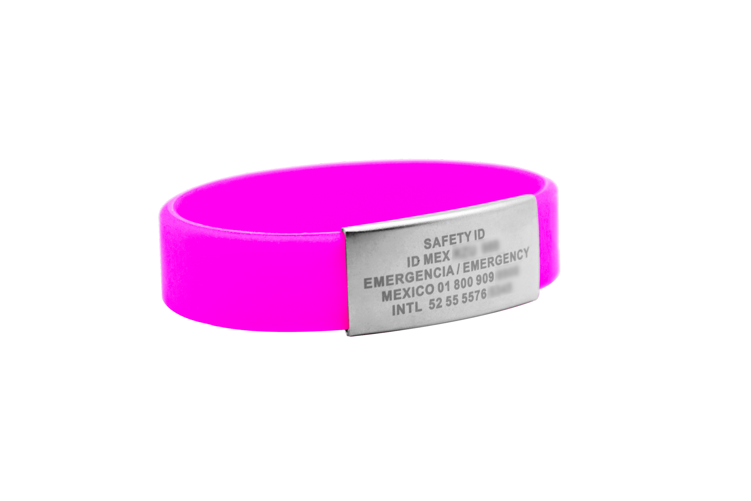Placa de identificación SAFETY ID en pulsera de silicón rosa.